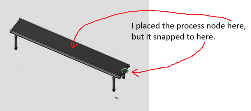 I insert a straight conveyor section and a process node into my layout. Both are standard parts from the eCatalog. When I use the PnP tool to place the process node somewhere along the conveyor, it always snaps to the end of the conveyor section, which is annoying. (Yes, I know I can move the process node with the move tool to were I want it)