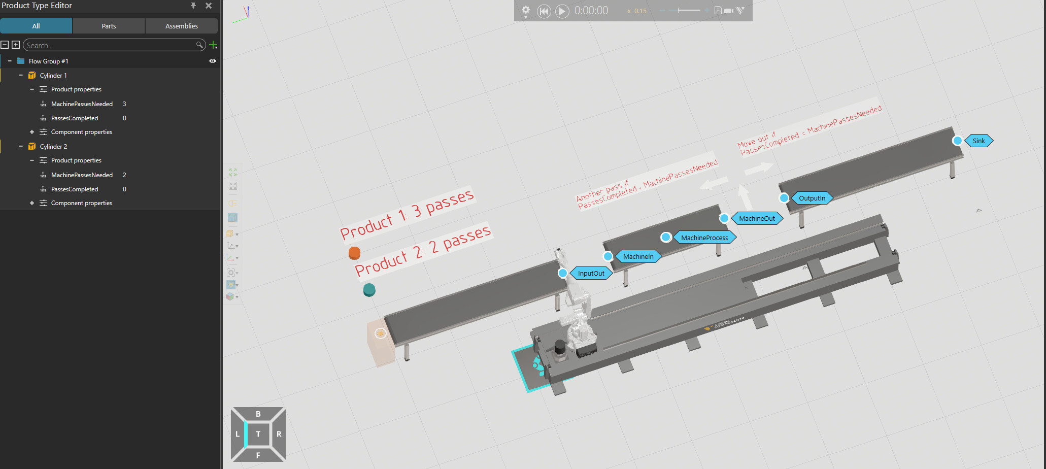 In this example I created 2 products with a property calledMachinePassesNeeded, but in reality there will be more products and each might need1...4passes in the machine. - Products move continuously and at the