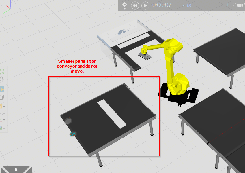 I have an Advanced Feeder feeding panels of various sizes. Robot picks the panels from the feeder and places them on a conveyor. Panels with a length of 1593mm and above will move to the end of the conveyor after it is released from the robot as intended. Panels with a length of less than 1593mm will not move on the conveyor after they are placed. They just sit there. The width of the part does not seem to affect the part moving on the conveyor after being placed, just the length. I noticed that the conveyor “TransitionSignal” does not turn on with the smaller parts, but does turn on with the larger parts. Any thoughts on what is going on with this?