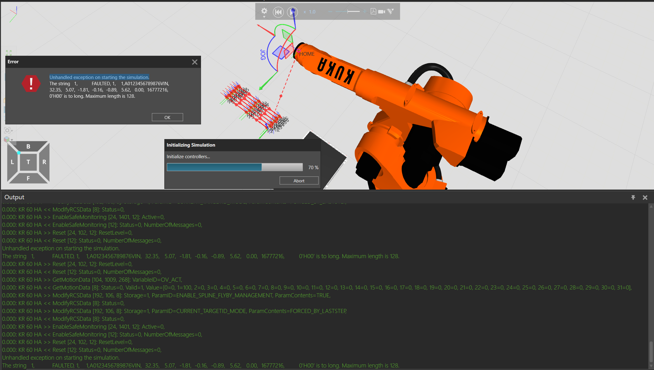 I am currently using a KUKA.Sim 4.10.335 and I am running into an issue whereby whenever i start the simulation, i will consistently get this error. I have tried to reinstall, redo the program etc, and I still have this error. I am unsure anymore what to do here and was hoping to get some help where i can rectify this error.