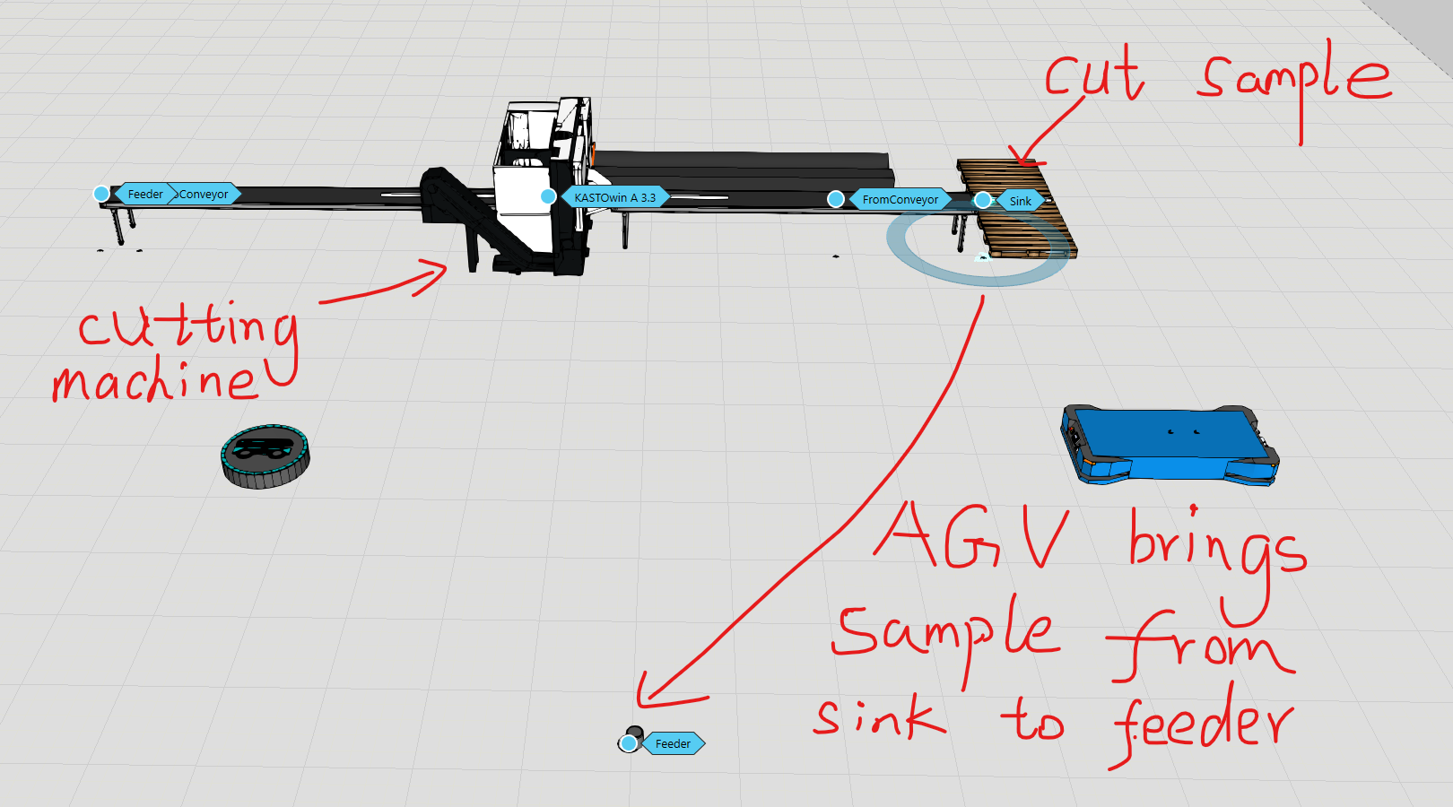 I am currently using Visual Components to simulate a cutting production line. Ideally, when all cut samples (e.g., 5 samples) are ready, an AGV should come and transport all of them to the next process. However, in my simulation, the AGV comes to pick up only one sample at a time.