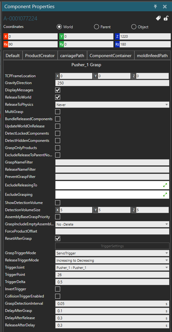 I’m a frequent user of the Grasp wizard and love its flexibility. Recently I have been working on a project where I need a pusher to push a product from a conveyor onto a carriage. In this operation the grasp wizard (pusher) grasps the product on the conveyor as it is supposed to. The ‘GraspTriggerMode’ is set to servo-trigger as the pusher always picks from the same position. The pusher then moves the product from the conveyor to a carriage where it is supposed to release the product to the carriage when it backs off again - but it does not. I have set the ReleaseTriggerMode to ‘Increasing to Decreasing‘ thinking that this would be optimal for this operation (grasping on a defined point and releasing whenever I set the pusher in reverse). I have tried to print different stuff in the grasping script and it seems like it never evaluates the servo-position when it is supposed to.