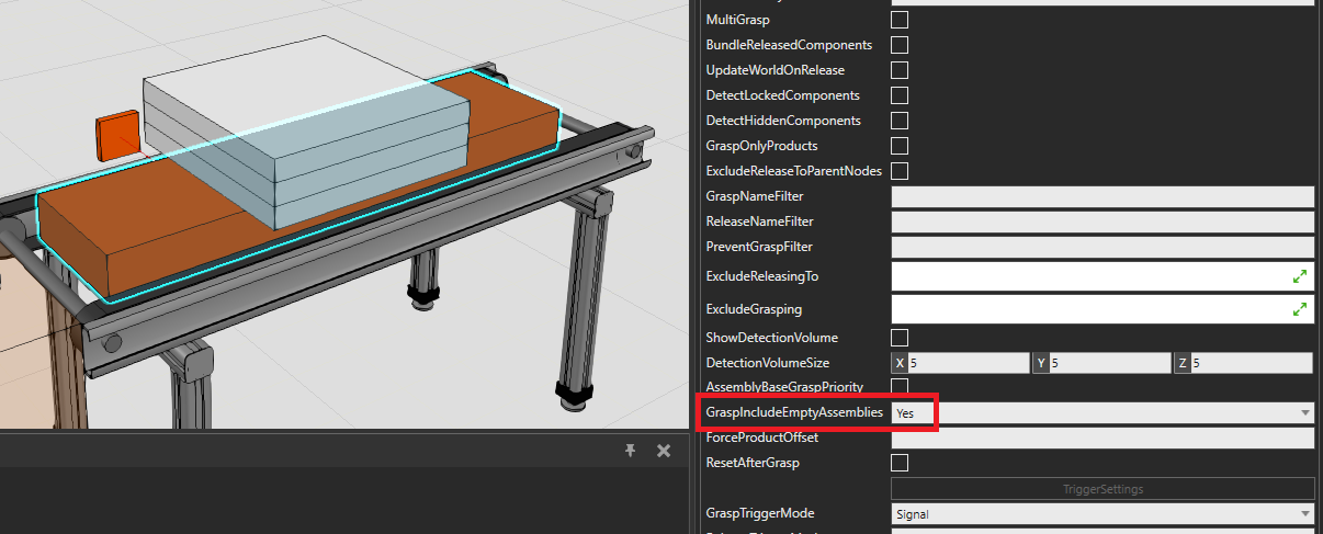By using GraspIncludeEmptyAssemblies = āYesā, the mechanism grasps the entire assembly instead of just the one part it detects.