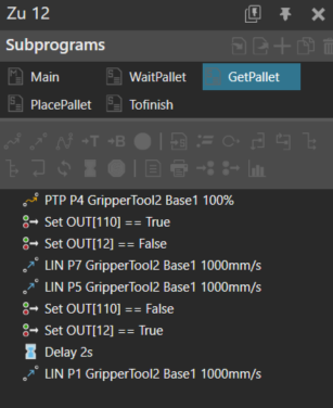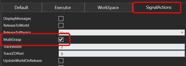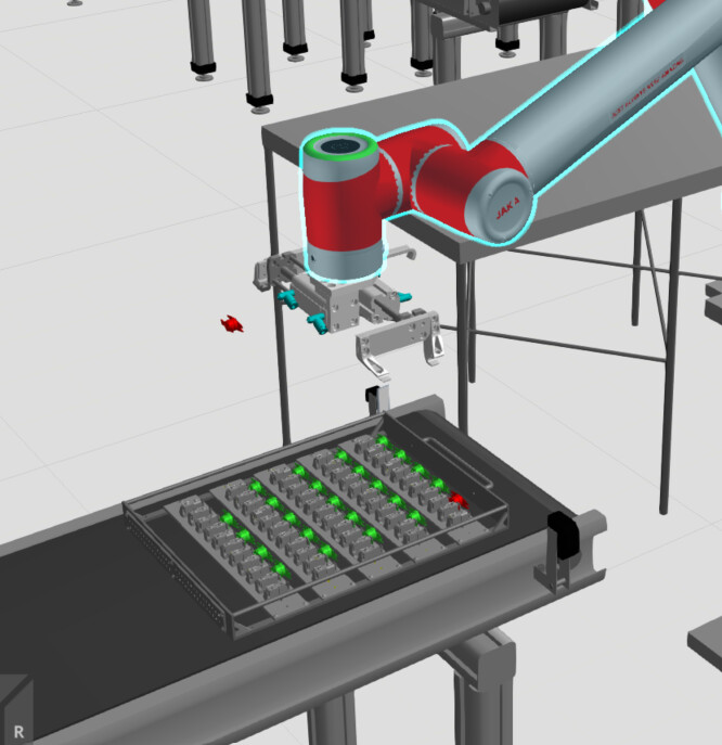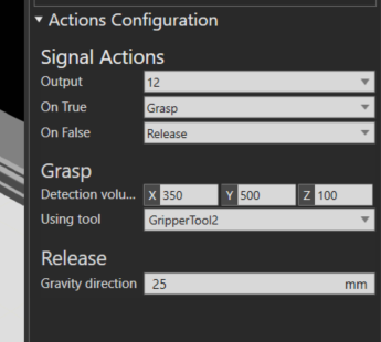 I have modeled the following gripper using the Visual Components tutorials for gripper modeling. However, the gripper does not seem to grip the entire pallet below it—it only detects one component. I have already increased the detection volume to cover the entire pallet in the Signal Actions.