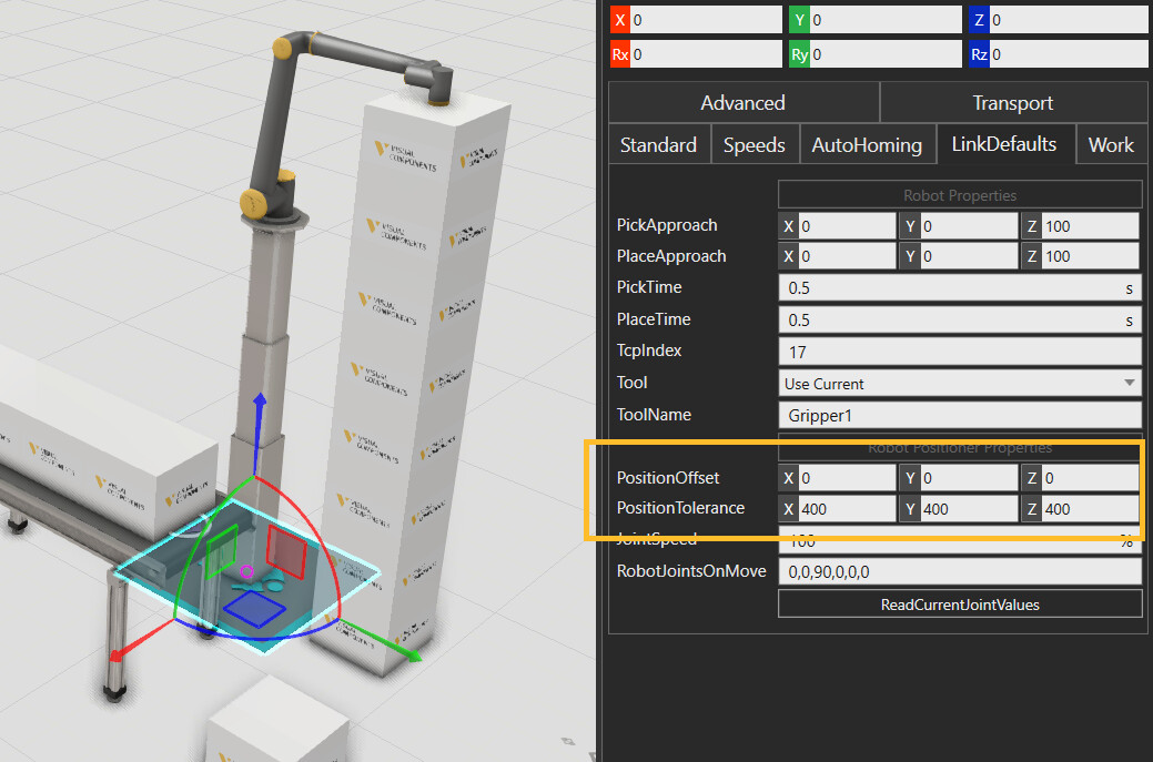 You said you’re using a process to pick the material, so I suppose you are using a Robot Transport Controller. So do you mean the offset parameters in the Robot transport Controller or in the TransportLink?