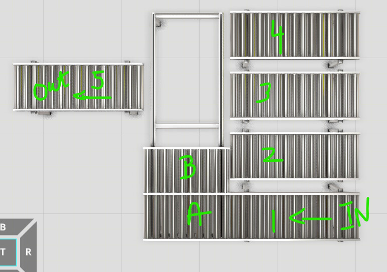 However, I still need to control which conveyor is active — for example, A for empty pallets in and B for full pallets out.