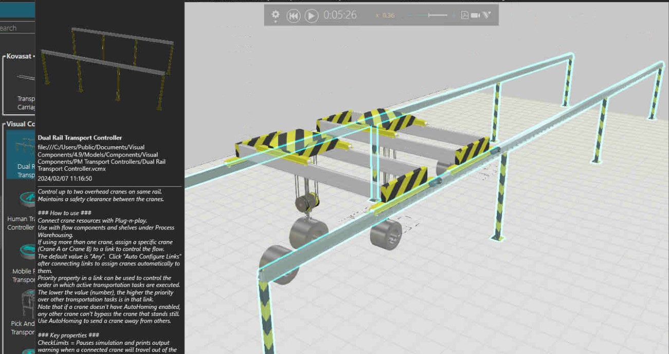 I am looking to model a Coil Steel warehouse that hosts multiple cranes in a single continuous long double rail, like hundreds of meters long and with 6 cranes that are able to work in overlapping zones.