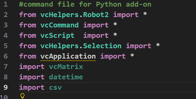 Module organization is similar to VC. Functions from vcScript, vcCommand, vcVector etc. can be imported.