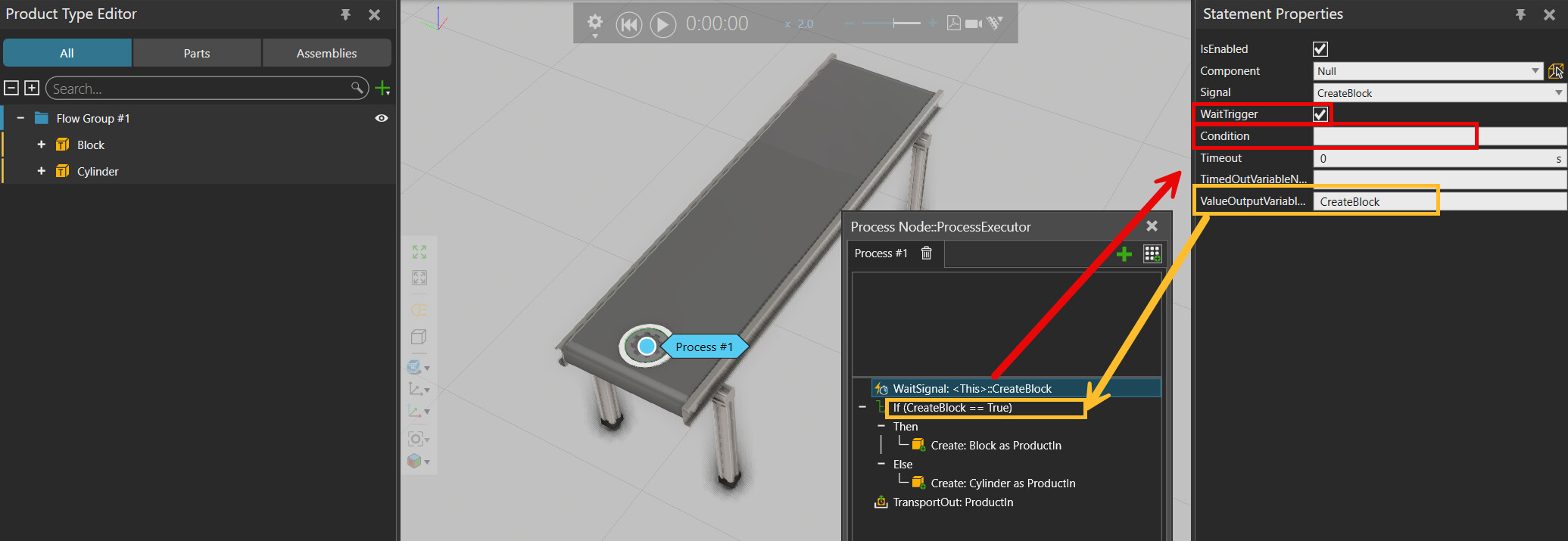 When the signal is triggered, you can use an If-loop in which you check the ValueOutputVariableName in the condition (or switch-loop if you are not using a boolean signal and can have more than 2 outputs) and then either Create a block, or a a cylinder according to the value.