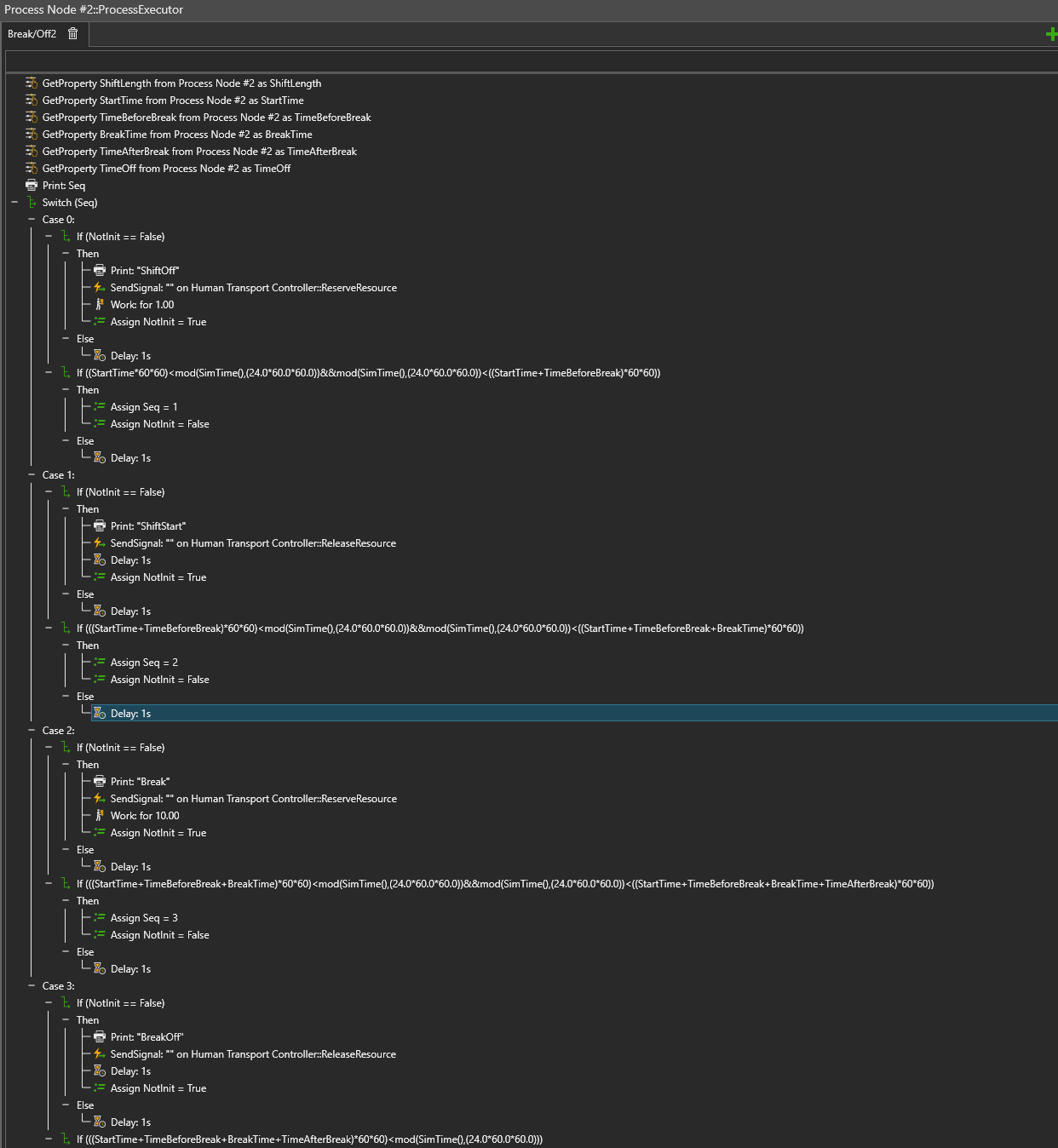 I’m currently building a layout of a production-line with a lot of manual processes. Some of the processes are extending normal work hours (where machines are handling the product), but during the day a lot of manual processes are made. I want to get a good estimation of the utilization of the workers and thereby getting an overview of, if the quantity of personnel is adequate or if they are too busy. My challenge is in the breaks/off-hours, where I can set the states of the human resources as working or idle, which does not leave me with a complete utilization estimation because it also accounts for the break and off-time. I’m interested in only the time the human resources are on shift. I have attached the PM-code that makes the human resources take brakes and start their shift in a defined schedule but I need to somehow pause the statistics of the specific resources when they are on break or off shift. To make it more complex I have 2 overlapping shifts, both 8 hours but 2 hours apart. My plan would be to change the capacity (recommended by VC support) of the resources when they are on break/off shift by sending a signal from the processes (process components) that control the break/off-shift shown in the attached screenshot, and then trigger the OnSignal in the human resources. The only thing now is that I’m, to my knowledge, not able to reserve specific resources to specific processes, or am I?