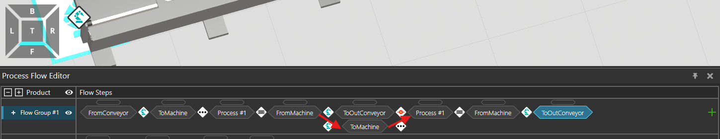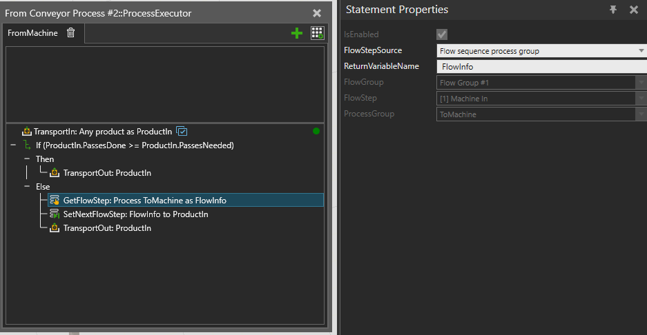 The flow editor doesn’t seem to allow for logic decisions. Only idea I can think of at the moment is adding in the MachineOut process an if statement with the comparison and then adding a RunRobotRoutine statement with a custom routine picking and placing product to the beginning of the machine, but not sure if this is the way to go.