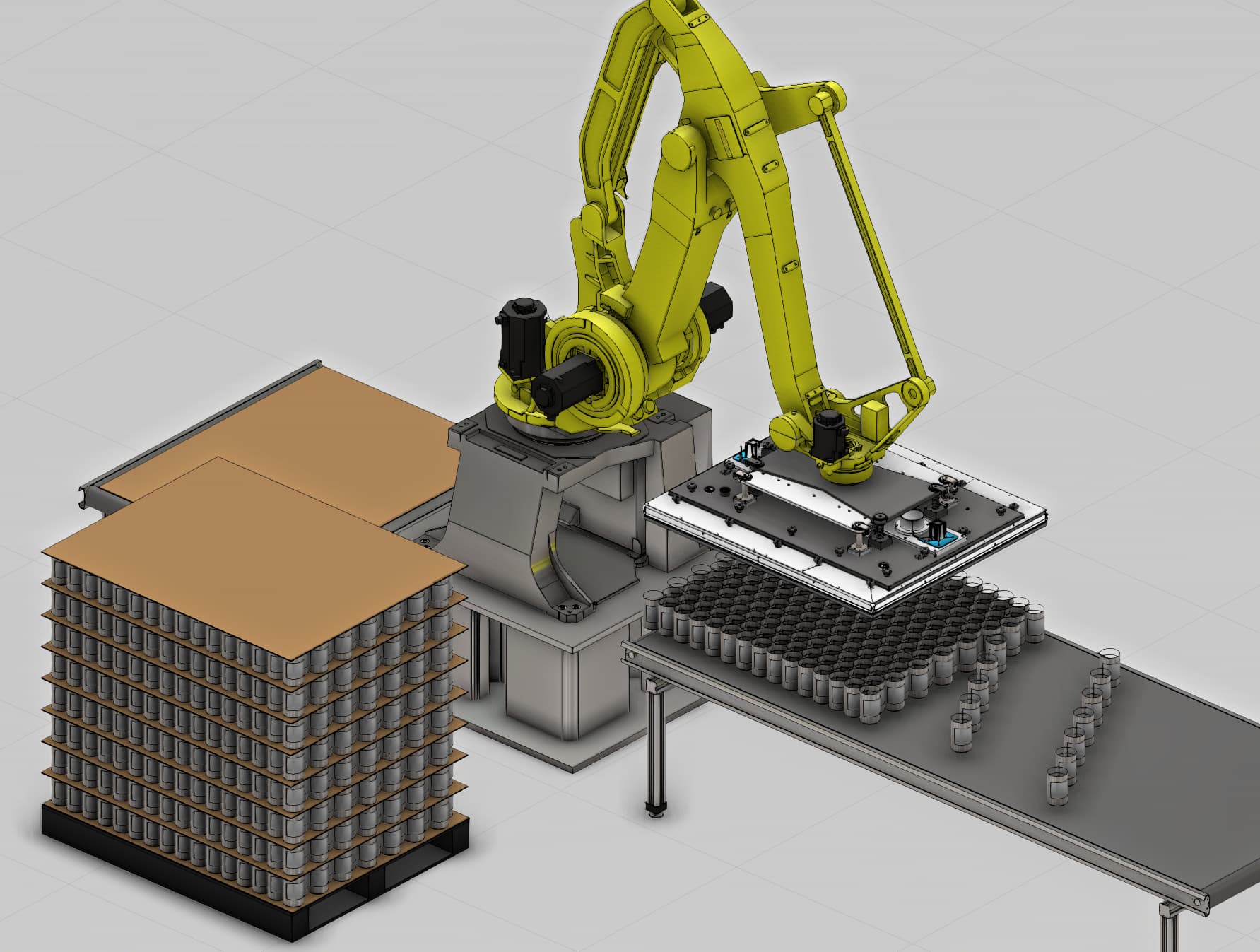 We can define each layer of the pallet as an assembly. That way, we can easily separate the cans from the assembly one-by-one, and also the grabbing operation is optimized, as we don’t need to use multi-grasping. The problem is just that you’d have to program the robot while the simulation is paused, as the cans and cardboards won’t exist before the simulation is started.