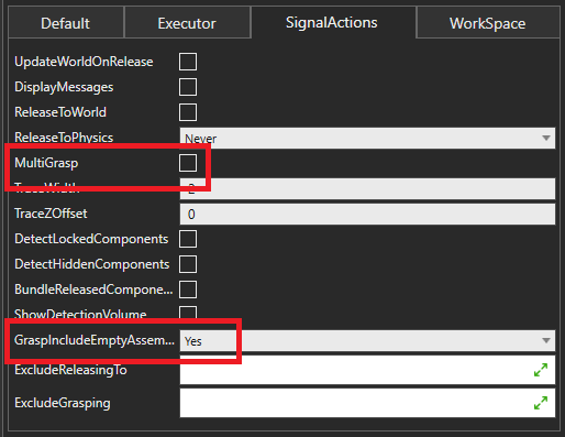 Multi-grasping is quite heavy on the performance, as the grasp volume detector needs to check every component in the 3D world on whether they are inside the grasp detection volume. When we choose value “Yes” for GraspIncludeEmptyAssemblies, the robot’s grasp volume detector stops looking for a component under the robot’s end effector as soon as it finds any of the cans in the assembly. The robot then grabs the entire assembly at once.