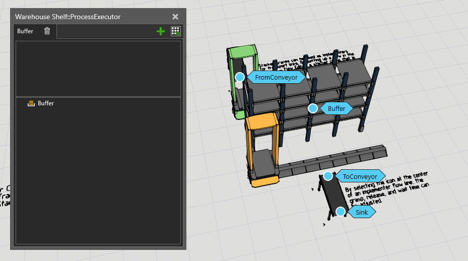 I just want to reach the statement properties to setting the product time on shelfs. At first try I was able to reach it by clicking on the process name “buffer” and clicking again on “Buffer” in the popup window, but now the statement properties do not appear if I try to open it and I dont know why. I checked some video, based on the videos I do it correctly. Maybe my license/program has a bug? (I tried to open a fully new project but same.)