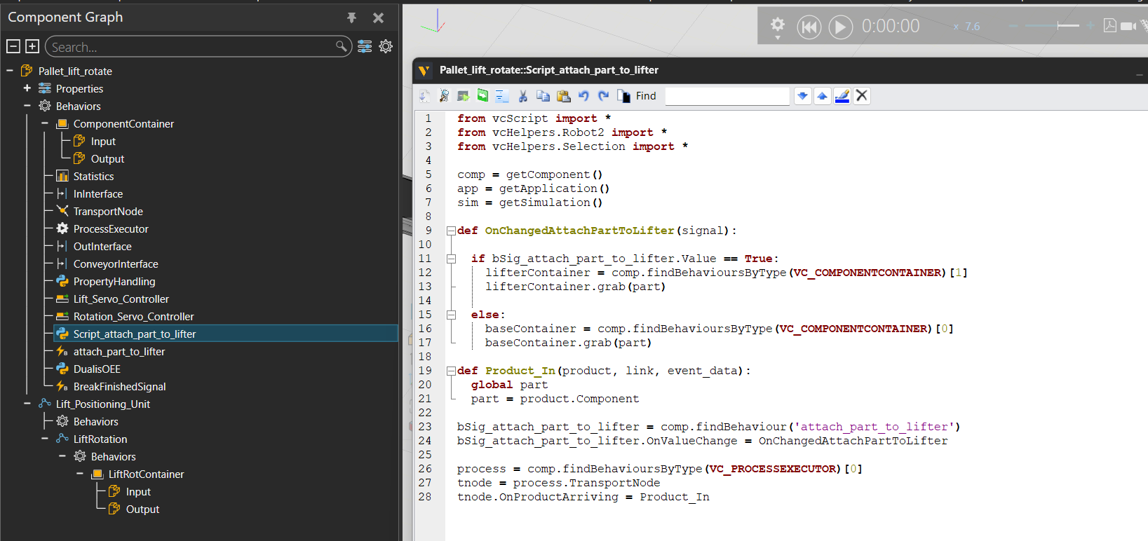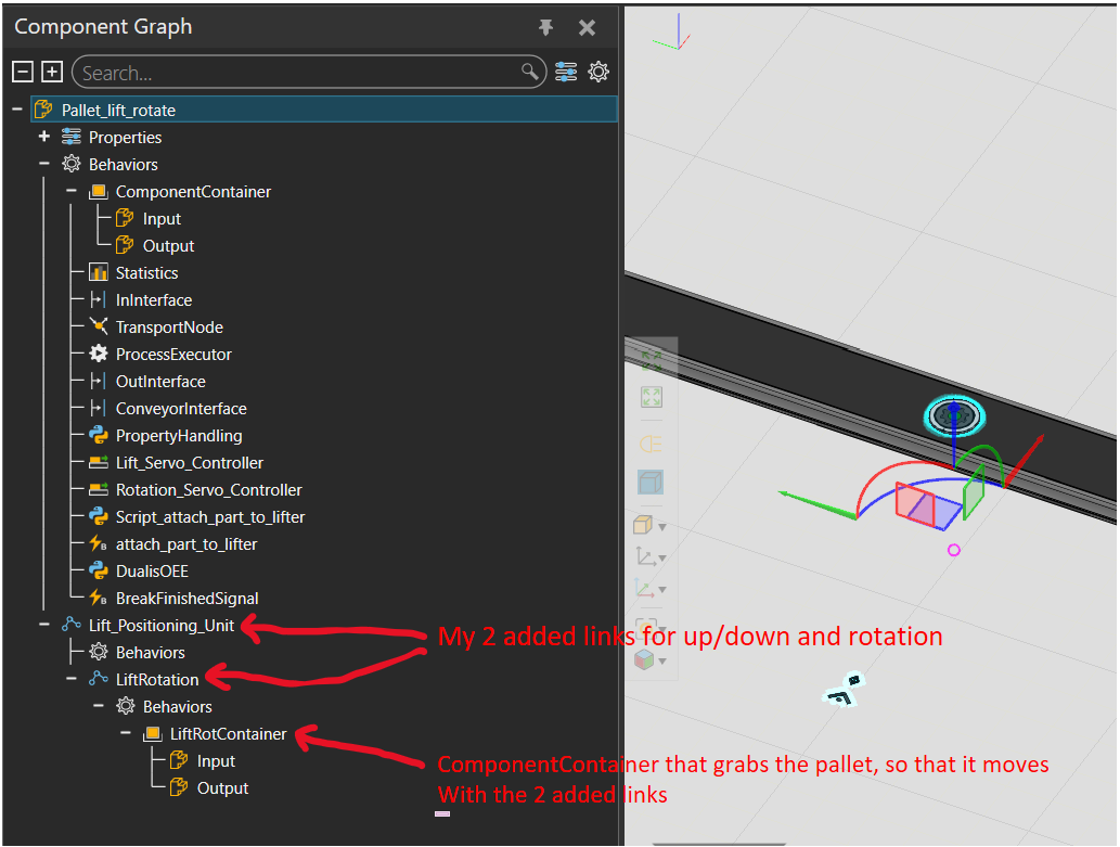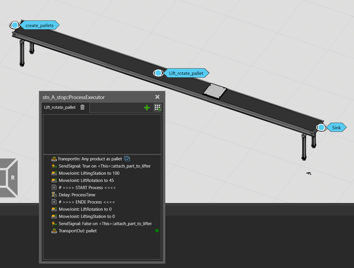 The signal “attach_part_to_lifter” is used to move the pallet to the “LiftRotContainer” (when True) or to put it back to the original “ComponentContainer” (when False). This is done in a python script.
