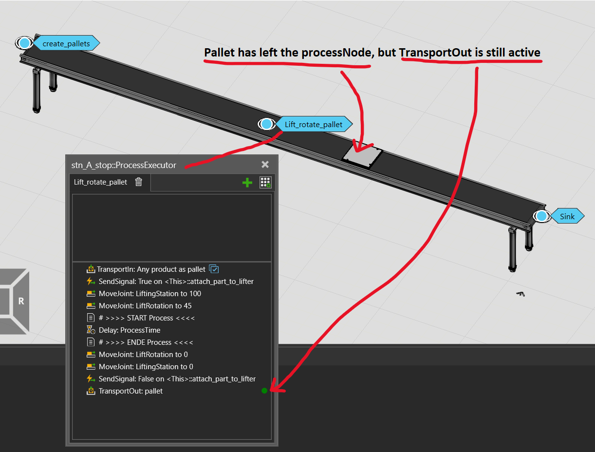 The problem is the TransportOut. It does release the pallet to the conveyor as expected, but it never finishes. So I assume, moving the pallet between containers ( .grab(part) in the python script) somehow messes something up.