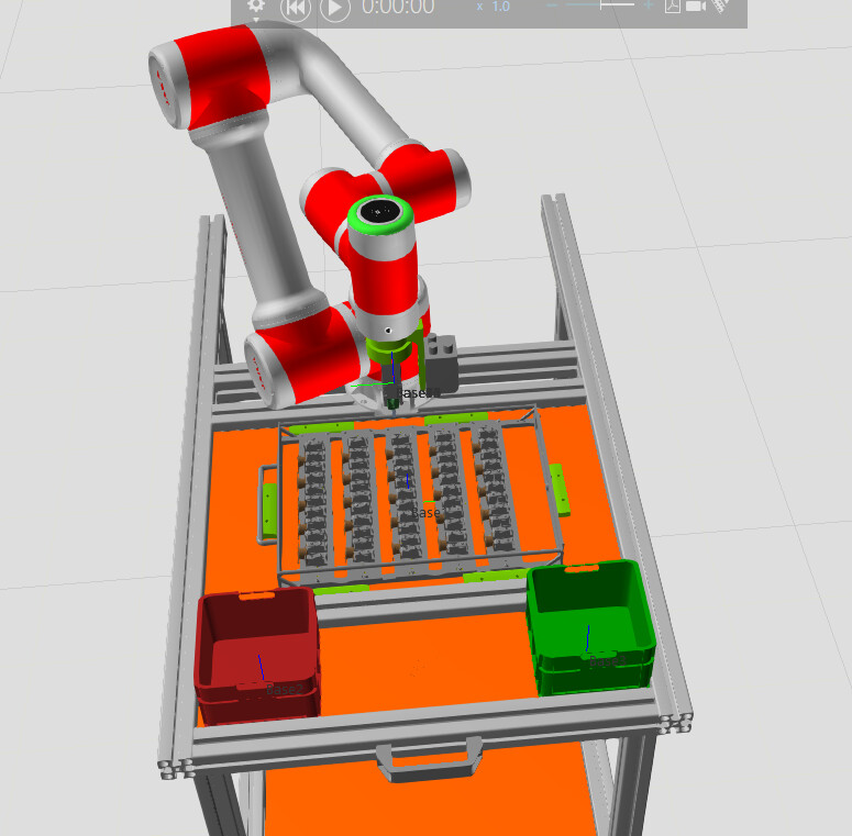 I am programming a sorting cell and would like to sort the components in the pallet into either the red (Base 2) or green (Base 3) container. I have attached the main section of my robot program as well as the subprograms. At the moment, the robot only brings the components to Base 2 (red container). Base 1 is defined on the platform underneath the pallet.
